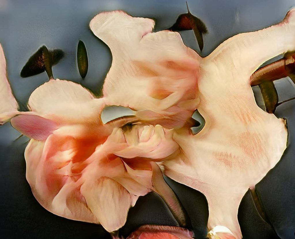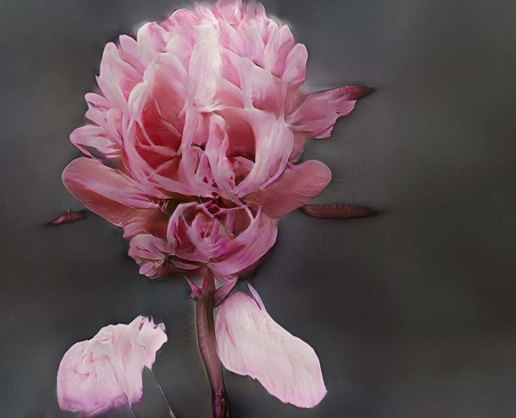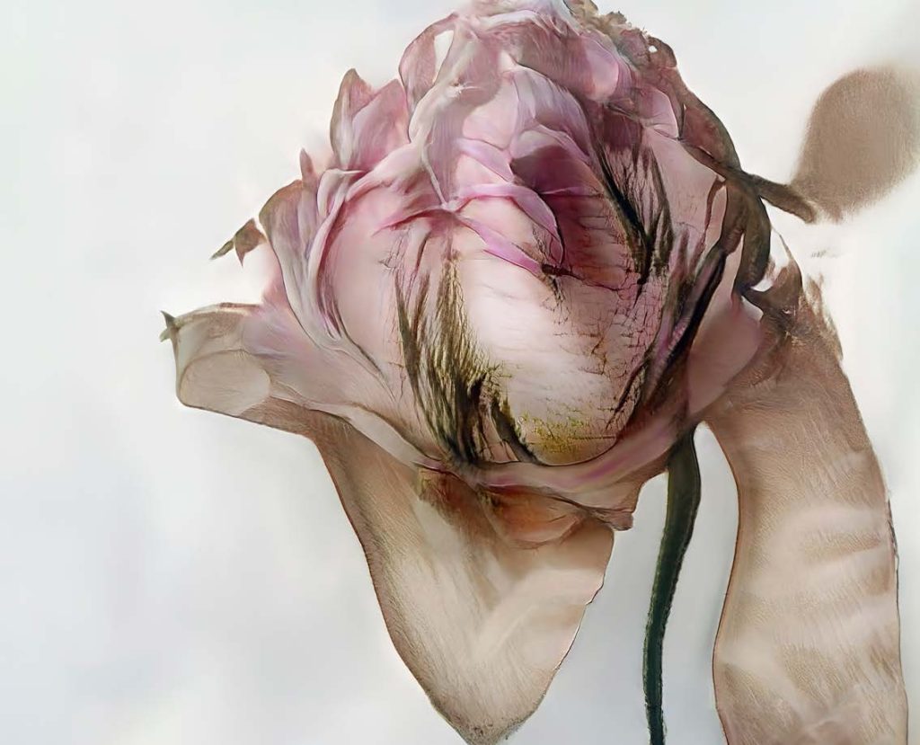 私が魅力的だと感じたのは、その不完全さでした。完璧でも、写実的でもない。摘み取れるような花には見えない。これは私の写真を学習して、それをモデルなりに解釈し、さらに私がそこから何を選び取るかを解釈する、という二重のプロセスです。非常に時間がかかり、遅く、扱いにくい。だからこそ、深く関われる。それがとても良かった。