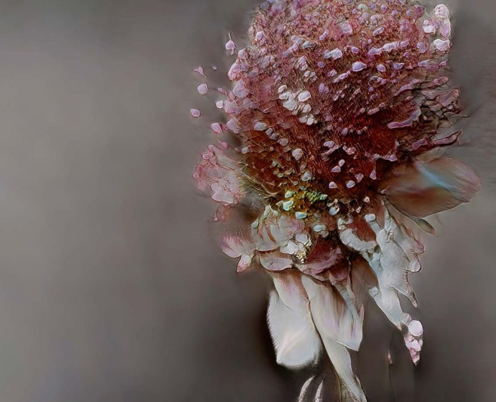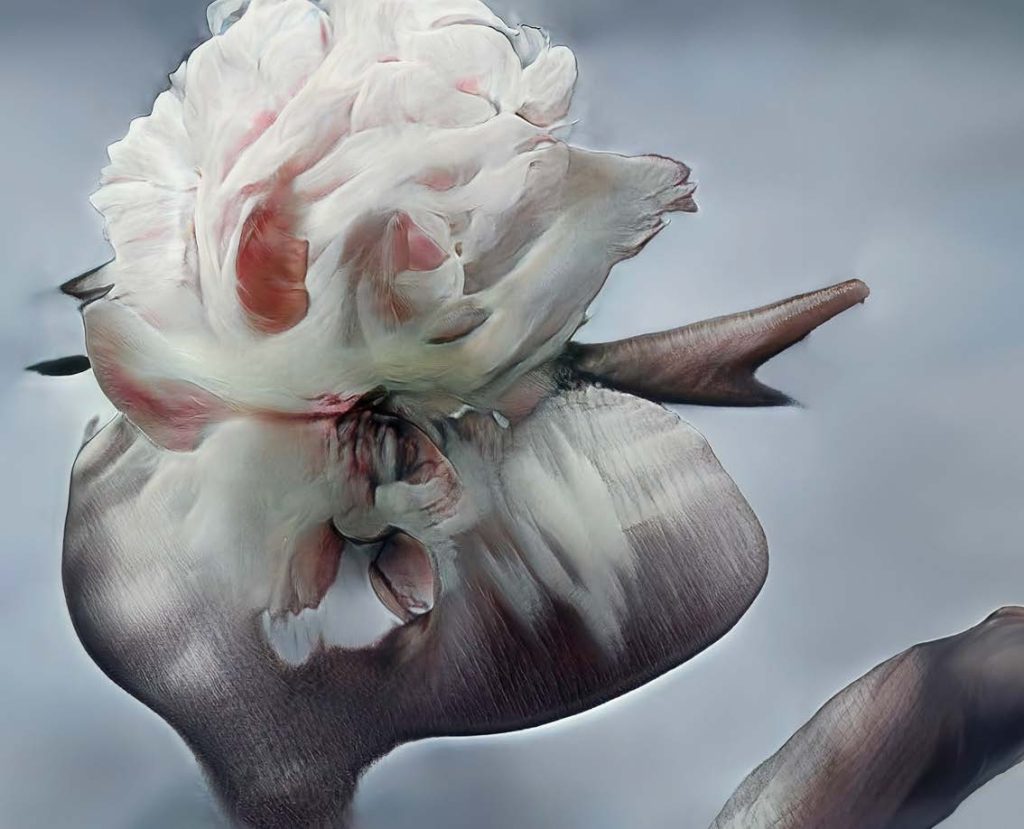 私は、自分が撮影してきた写真だけを学習素材として使いました。ゲラン、シャネル、ランコムなどのために何十年も撮り続けてきた花の写真です。機械学習モデルに自分のアーカイブを与え、「画像同士の関係性を見つけてほしい」と指示します。すると複数の候補が生成される。その中から自分が気に入ったものを選び、再びフィードバックしていく。つまり、自分の選択によってモデルを“しつけていく”感覚です。