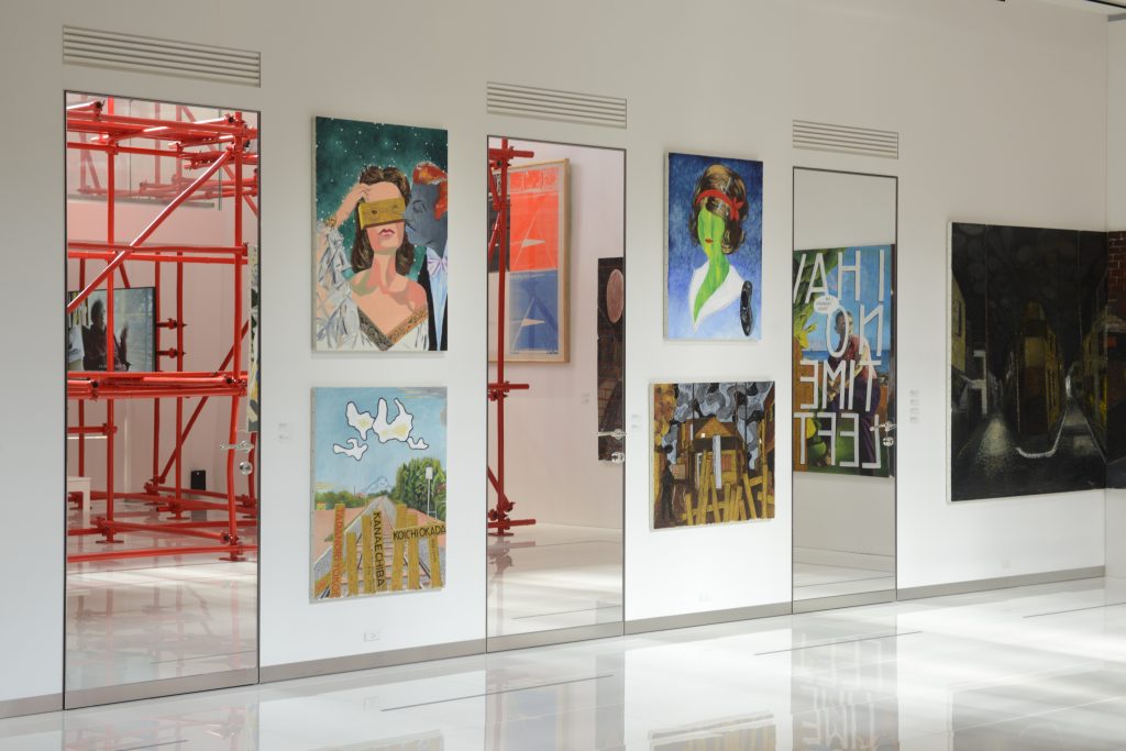 インスタレーション作品「未完の足場」(2025)はギャラリーの吹き抜けと屋上に設置されている。また本展では、右手前のようなシルクスクリーンの作品も展示されている。
