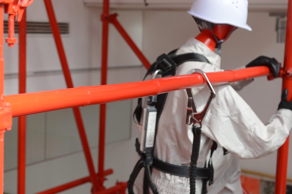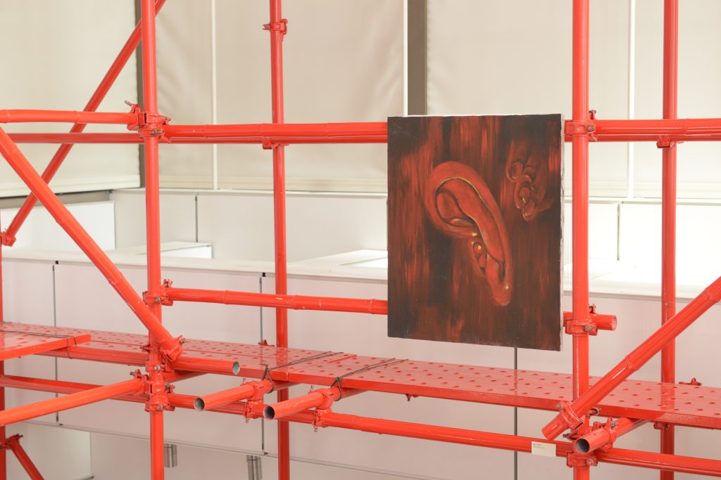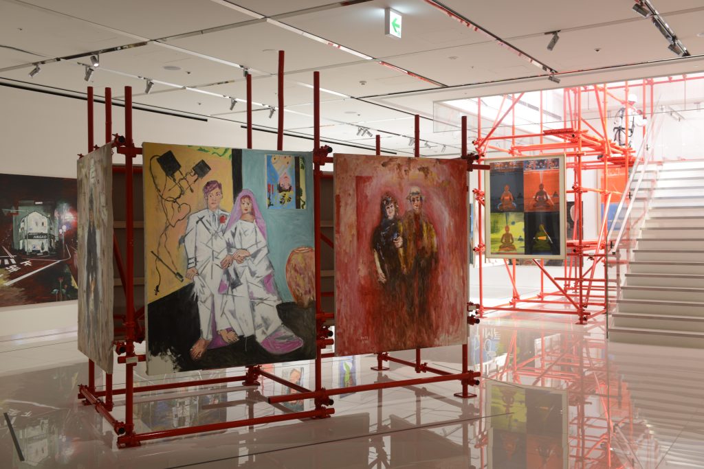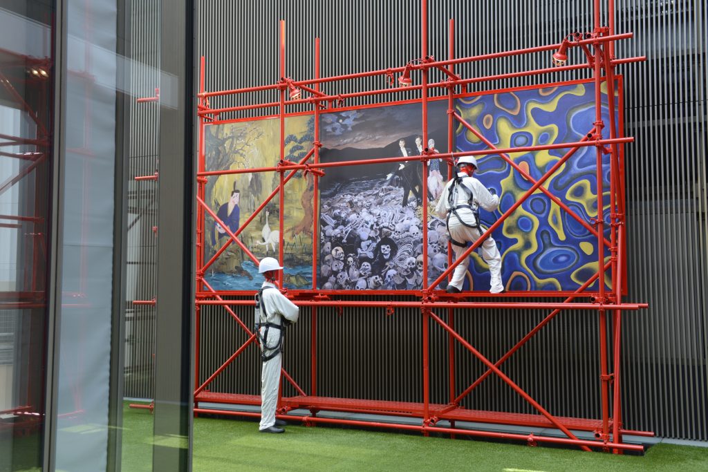 赤色の足場は7階のギャラリーフロアから屋上までの吹き抜け空間に設置され、さらに屋上には豊島横尾館に展示されている大作『原始宇宙』のレプリカとともに足場が設えられた。足場には作業服に身を包んだ人形も配置され、「未完」の状態が強調されている。