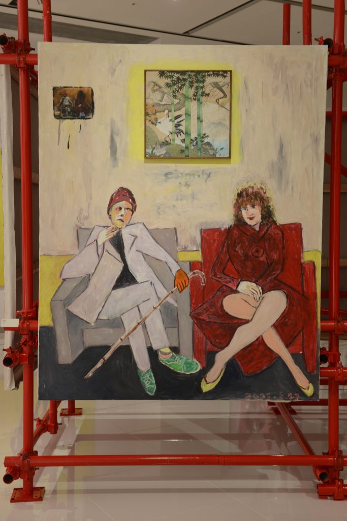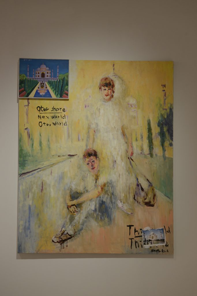 特に印象的なのが、会期延長にあたって加えられた新作も含む、横尾自身と家族を描いた作品だ。展覧会タイトルにもある通り、近年横尾は自画像を数多く手がけているが、今回展示されている作品の中には、泰江夫人とのツーショット、さらには泰江夫人が描いた絵を組み込んだ(コラージュした)ものがあり、これまでの横尾作品とはまたひと味違った、新鮮な存在感がある。