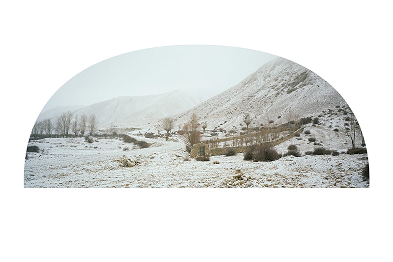 津田は仏教の原点を自分の目でとらえるため約15年前からチベット仏教圏を訪れ、古代から続く自然と人間の関係性を切り取ってきた。『LO』の舞台は、ヒマラヤ山脈がそびえ立つネパールの奥地、ムスタン。チベット高原と地続きの文化を色濃く残し、1992年まで鎖国状態、2008年まで王国として存在していたムスタンは、現在も入域許可を必要とする地域として知られている。標高3,840mに位置する山々を歩いた津田は「地上を歩いていないような浮遊感」を覚えたという。この体験は、津田が少年時代に行っていた早朝登山とリンクした。犬を連れて実家から山へ続く道を進み、沢の音に耳を澄ませ、苔むした谷筋付近の滝の水しぶきが舞う場所で目を閉じる。自然と交差する祈りのようなその行為を千日以上続けたその後、津田はカメラに出会い、自分の目に映っている光景をレンズに置き換えるようになった。