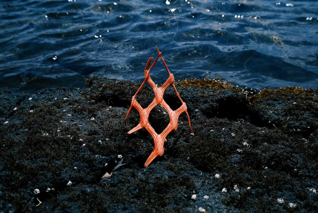 作品の出発点は、石油という太古の生物に由来する物質が、人間の手によってプラスチックへと加工され、再び自然環境の中で変質していく循環にある。柴田は北海道・利尻島で採取した海洋プラスチックを、火山由来の溶岩石の上に配置し撮影する。波や風、太陽といった自然の作用を受けたそれらは、有機物のような質感を帯び、もはや人工物と自然物の境界を曖昧にする存在として立ち現れる。