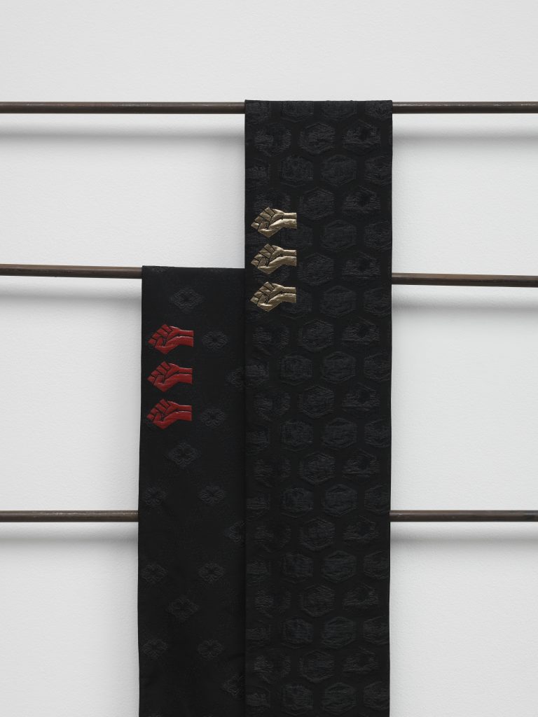 さらに、日本の帯を用いた作品では、1960年代のブラック・パワー運動の記憶が織り込まれる。マーティン・ルーサー・キングやマルコムXといった人物の歴史が、帯の意匠として再構成されることで、工芸と政治、記憶と身体が交差する表現が生まれる。