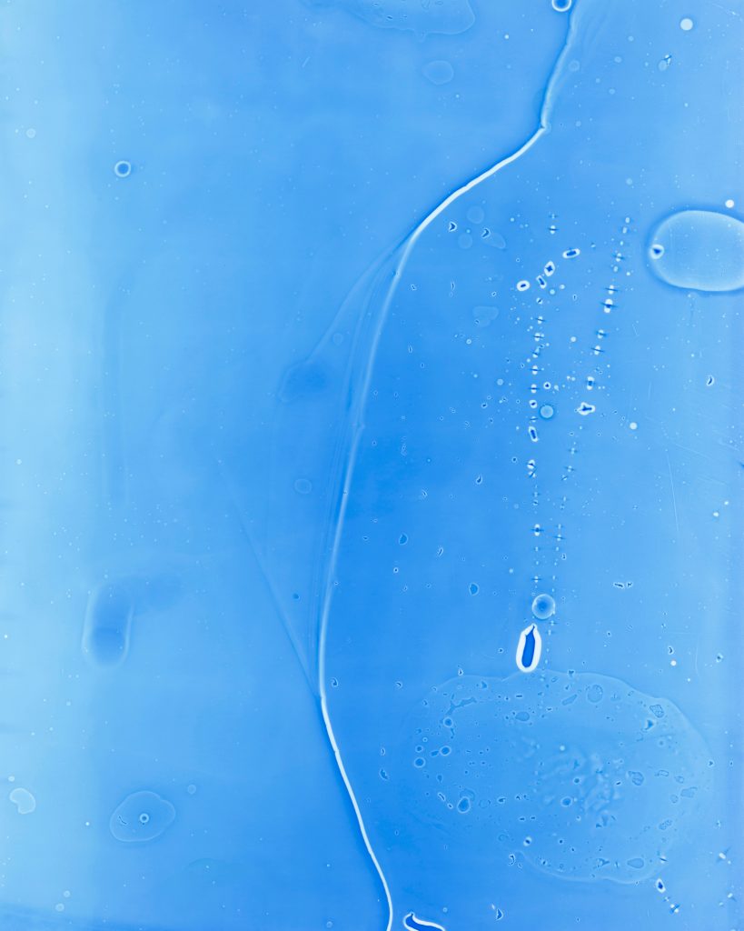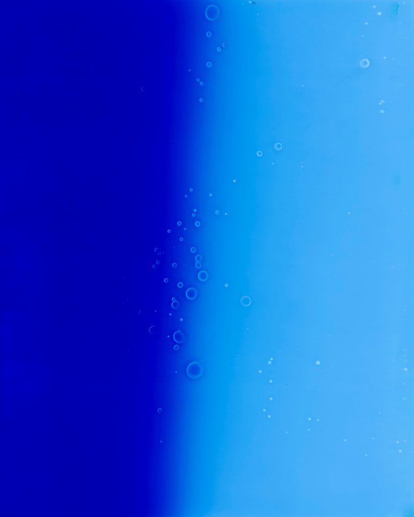 展示作品は、カメラを用いず、水と光、印画紙のみを用いて制作されている。暗室の中で水に直接触れながら行われるプロセスは、写真を光学的記録から切り離し、物質との関係性の中で再構築するものだ。水の揺らぎや滞留といった性質は、そのまま像として定着し、すべての作品は複製不可能なユニークピースとして存在する。